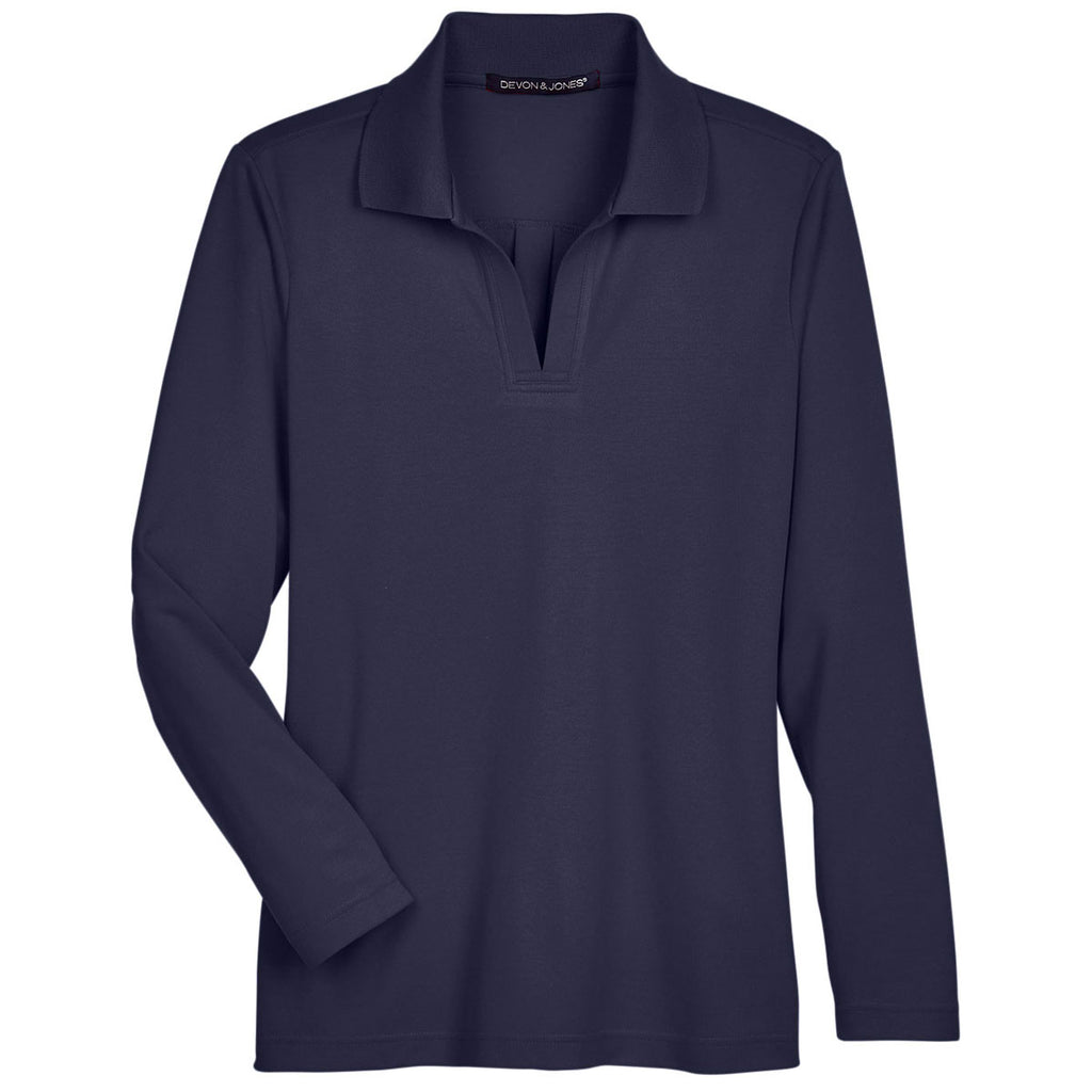 Give your company a clean, professional corporate look and boost team spirit in a flattering style with your custom logo embroidered on Devon & Jones Women's Navy CrownLux Performance Plaited Long Sleeve Polo. This No Button Long Sleeve Women's Polo features an opened placket without buttons that punctuates your team with preppy panache. A relaxed cut brings daylong comfort. Breathable, lightweight cotton-blend construction enhanced with moisture-wicking and UV protection offers uncompromising comfort throughout the day. Looks great solo or layered with a cardigan. Customise this women's full-sleeve polo to not only promote your business by turning wearers into mobile hoardings but also to instil a sense of pride and team loyalty in your employees.Corresponding Men's Style: Devon & Jones Men's Navy CrownLux Performance Plaited Long Sleeve Polo