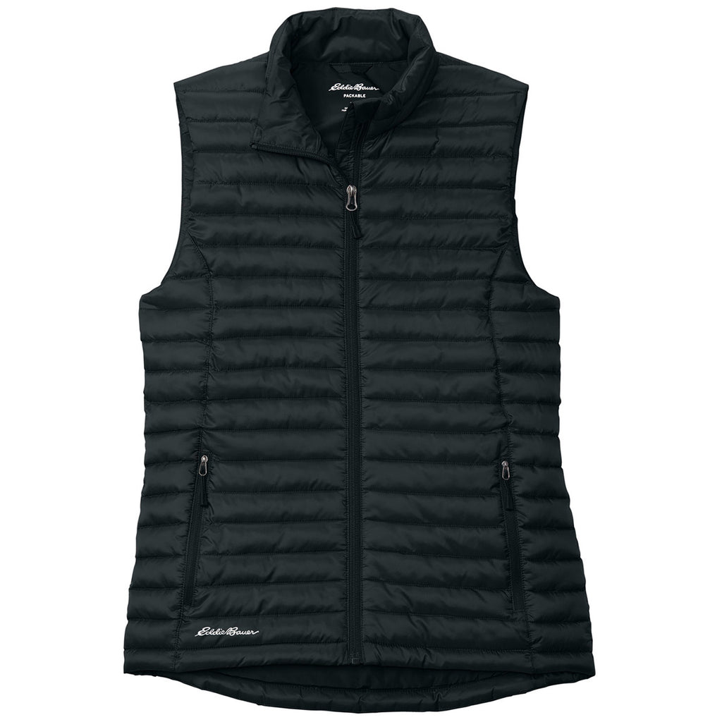 Eddie Bauer Women's Black Packable Quilted Vest with a custom logo is a must-have for the adventurers in your life. Made for warmth and weather-resistant performance, this vest packs into its own left pocket when not in use. Ideal for hiking, biking, jogging, and more. Place your order now before supplies run out.This product can only ship within the United States, Puerto Rico, Canada, and Mexico.