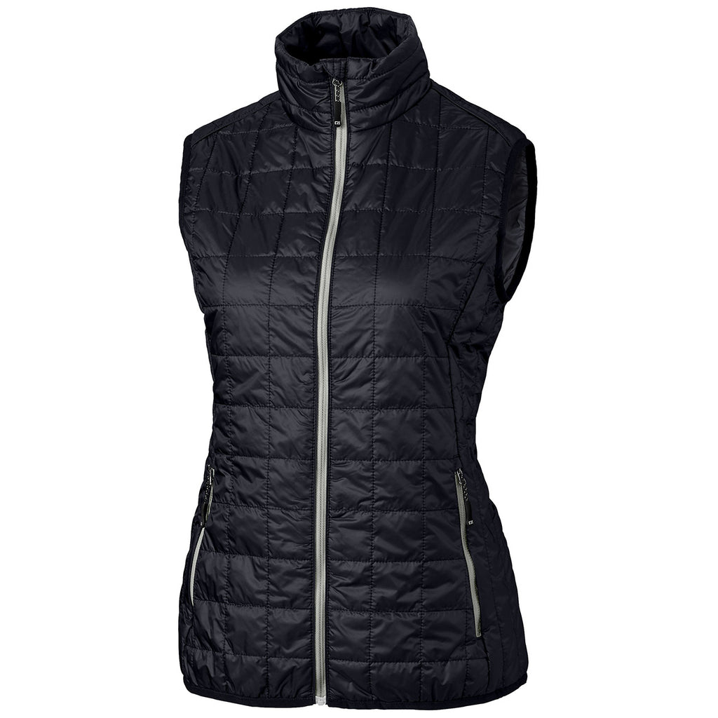Quilted vests are in, and when you put your custom logo on this Cutter & Buck Women's Dark Navy/Silver Melange Rainier Vest, everyone will know you are a company that keeps up with the times. It is insulted and made from easy-care taffeta. It has a mock turtle neck, full zipper front and front pockets with zippers. The wind will be kept at bay with the elastic bound armholes and hem. For your embroidered logo there is zip in lining for embroidery access. There is Primaloft fill that is packable into the left front pocket. This vest is machine washable in cold water on the delicate cycle.Highlights