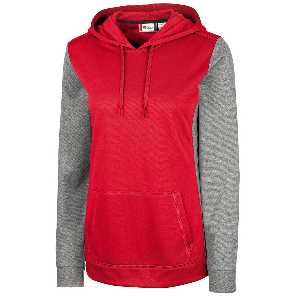 The Clique Women's Cardinal Red Helsa Sport Colorblock Pulloveroffers stylish comfort that can have a custom logo added to the front. Choose from unique color options and enjoy product features including a 100% polyester fleece material, attached hood with drawstring, long sleeve cuffs in heather fabric, and a kangaroo pocket. This pullover sweatshirt makes an ideal corporate apparel gift to hand out at golf events or trade shows. You can even purchase some for your employees and hand these out as employee apparel.Corresponding Men's Style:Clique Men's Cardinal Red Helsa Sport Colorblock Pullover