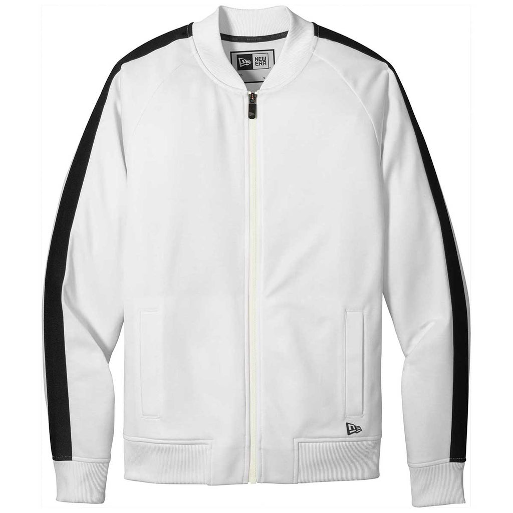 Demonstrate style with a custom embroidery New Era Men's White/Black Track Jacket. Perfect to use with a custom logo for team events, this cotton, poly blend has a matte finish in a modern new design. Keep muscles warm and loose as this track jacket is easily layered over a jersey or uniform. Add a company logo as part of employee uniforms or to offer as employee gifts for events and holidays. The tag free design offers added comfort with elastic trim sleeves and a Vislon locking zipper for the perfect fit. Front pockets keep small items at hand whether enjoying a game or jogging before work.