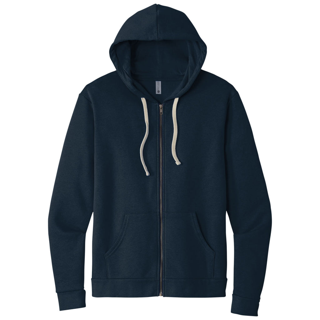 Relax and unwind with a custom Next Level Unisex Midnight Navy Beach Fleece Full-Zip Hoodie made of a cotton rich poly blend in a lighter midweight material with a cotton face. Choose a company logo to have screen printed on the hoodie for the perfect employee gift that everyone can enjoy. Created with simple front pockets, a jersey lined hood with natural flat drawcord, and a tear away label, this hoodie will fit into nearly every wardrobe. Try a custom logo to build up your logoed apparel line or to give as custom gifts to loved ones. Nothing is better on a chilly day then a comfortable full-zip hoodie that can be layered with your favorite tee as you work and play.Highlights