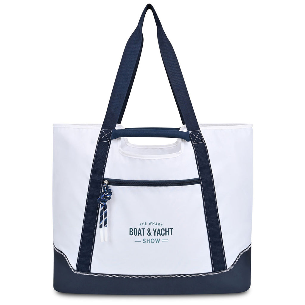 A nautical sense of style gives the Gemline White Harborside XL Boat Tote a crisp, classic appearance that will appeal to audiences of all ages. Your company's custom logo or design will take center stage on this portable bag, which is great for storing snacks, accessories, and other gear before heading out on the water.