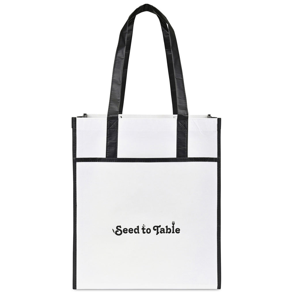 Add your corporate logo to the Gemline Black Harlow Laminated Recycled Shopper with colorful accents to be more eco-conscious while grocery shopping, running errands, or just shuttling the kids from place to place. These large bags with a roomy main compartment and extra front slash pocket are easy to use and then fold up for storage.The minimum order for this product is 150 pieces.