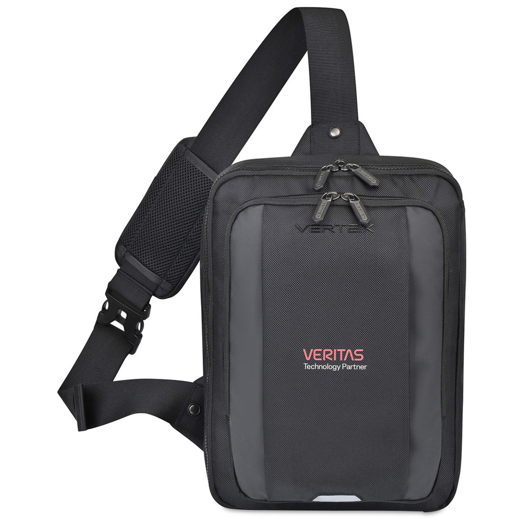 Vertex Black Brooklyn Tech Sling with a corporate logo is the perfect way to carry your small laptop or tablet on the go. The padded compartment holds up to a 13" laptop or 10" tablet with adjustable shoulder strap and a pocket for extras. Perfect for those who work outdoors but need to access their tech or those on the road.