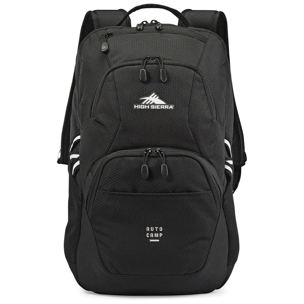 High Sierra Black Swoop SG Laptop Backpack with a custom logo is perfect for travel, school, or work with a padded laptop pocket that fits up to a 17" laptop and a separate tablet sleeve. A separate fleece lined pocket is great for sunglasses and phones to help you stay organized.