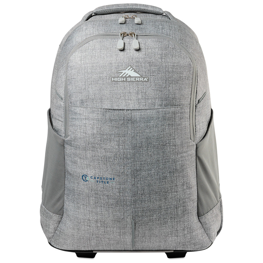Enjoy travel with a custom High Sierra Silver Heather Powerglide Pro Wheeled Backpack. This large rolling backpack is perfect for work, school, or quick trips with wheels that easily maneuver and then tuck away when not needed. A large padded compartment holds laptops up to 17", and outside pockets for water bottles, keys, and tech help keep you organized and ready.