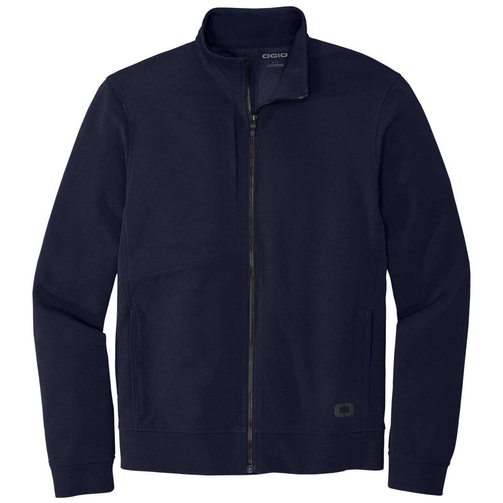 Look great in a custom logo OGIO Men's River Blue Navy Hinge Full-Zip that brings a sophisticated look to a jacket that can serve as an everyday wear or for certain activities like working out. Made of 100% poly with a cadet collar, this full zip jacket can be easily layered over a tank or tee. Add a company logo to use as employee uniforms for when the weather gets chilly or to create a cohesive look that works at the jobsite or as part of a team. Your logoed apparel line will benefit from the modern appeal that this full zip offers.