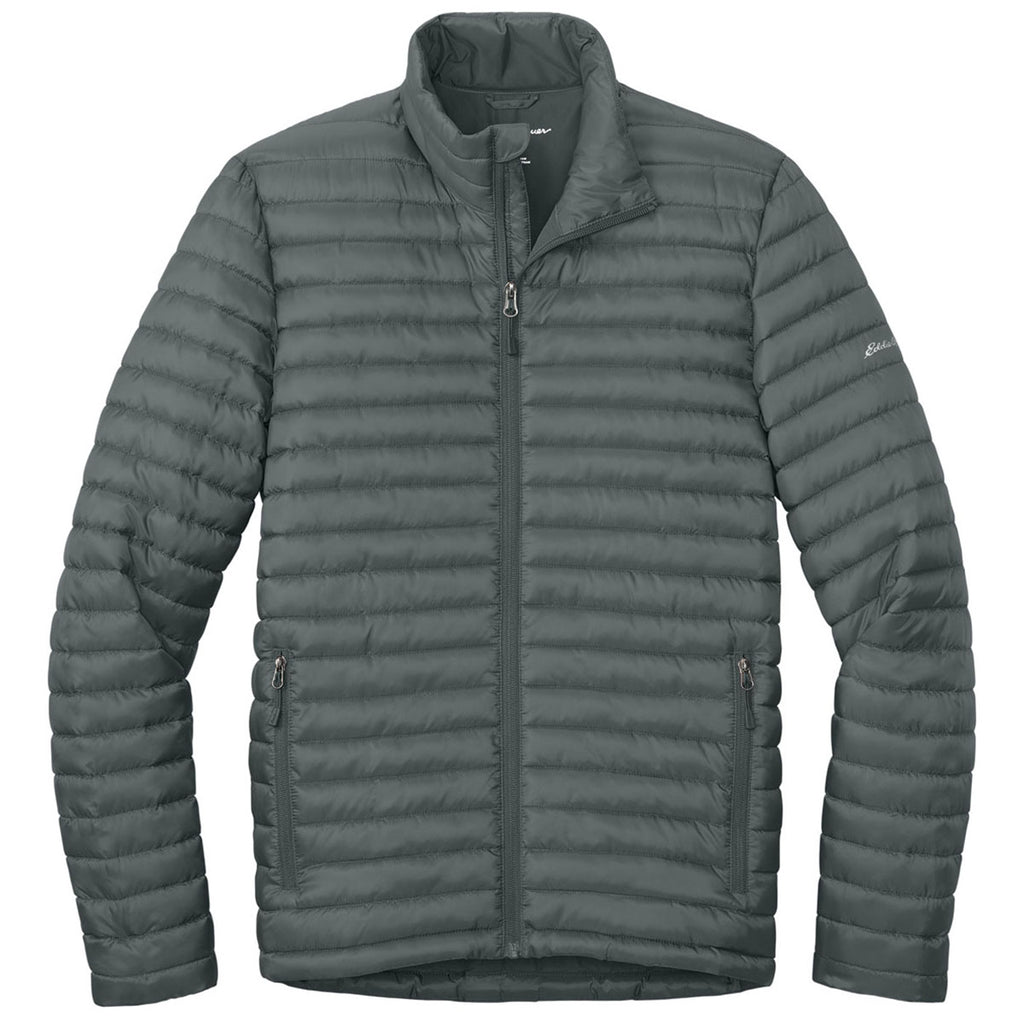 Eddie Bauer Men's Metal Grey Packable Quilted Full-Zip with a corporate logo will be an instant hit with buyers and wearers. The high-end jacket, with quilted lines in a traditional pattern, is warm without being bulky. The weather-resistant performance makes this great for outdoor work or play, no matter the weather conditions.