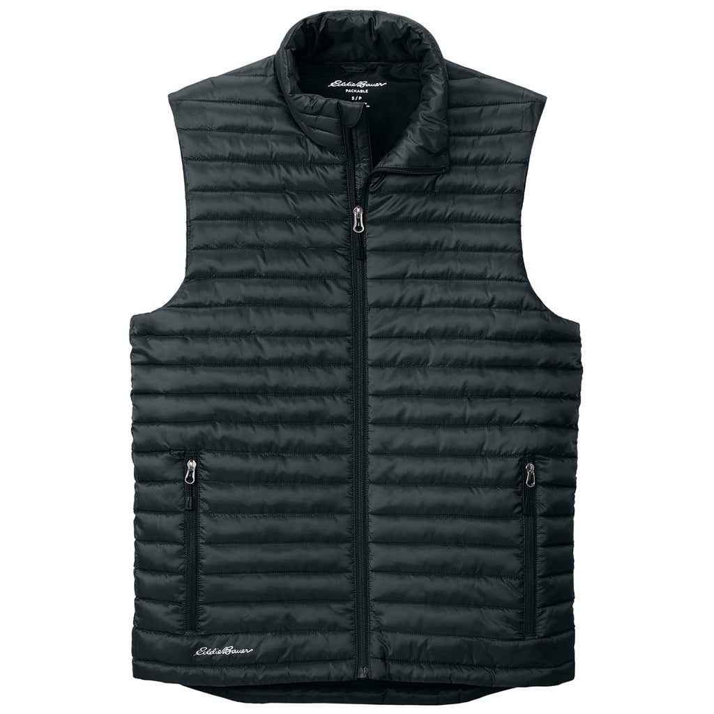 Eddie Bauer Men's Black Packable Quilted Vest with a custom design is a fun and functional way to stay toasty while enjoying the Great Outdoors. This packable vest can be worn and then easily packed away when it is no longer needed for the day. Perfect for hiking, camping, and hunting. Place an order right away.This product can only ship within the United States, Puerto Rico, Canada, and Mexico.