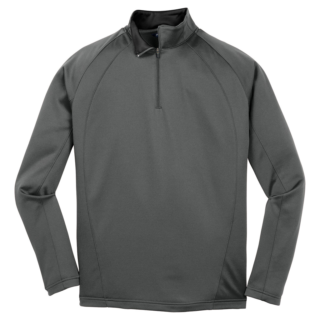 Want a fleece pullover that offers a subtle twist on its monochromatic brethren? Then allow us to introduce you to the Sport-Tek Men's Dark Smoke Grey/Black Sport-Wick 1/4-Zip Fleece Pullover. Sure, this pullover is lightweight featuring an 8-ounce, 100% polyester fabric that keeps you protected without feeling like you're carrying a backpack. Sure, the pullover looks good, what with its raglan sleeves and open cuff and hem. But what really separates this pullover from the other ones on the market is the differentiated inside collar. Add your company's logo to the front for an even greater burst of color and you'll have a piece that stands out from every fleece you'll see this winter.