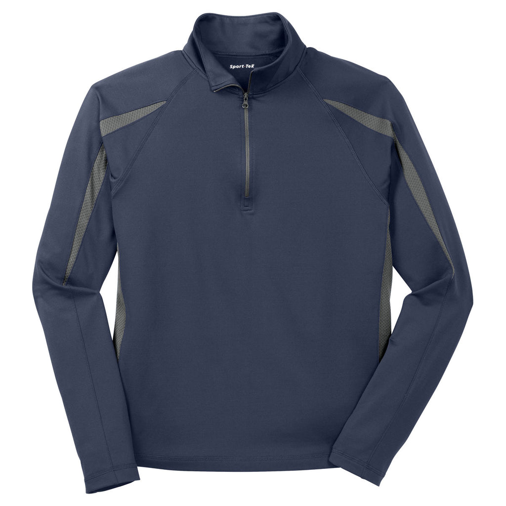 When the weather gets tough, so must you. That's the idea behind this Sport-Tek Men's True Navy/ Charcoal Grey Sport-Wick Stretch 1/2-Zip Colorblock Pullover. Add your own custom embroidery to make this a piece of corporate apparel that anyone can enjoy. Layering is ideally suited to serve as your canvas, and this is an item that will work for you in the elements, not against.Highlights