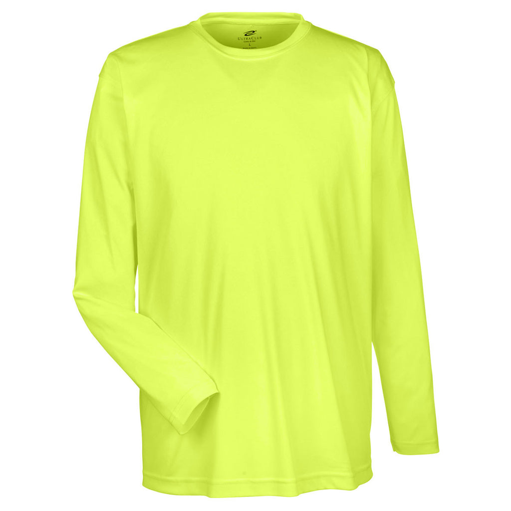 The UltraClub Men's Bright Yellow Cool & Dry Sport Long-Sleeve Performance Interlock T-Shirt contains moisture wicking technology that prevents sweat from ruining your day. Snag-resistant 100% micro-polyester refuses to rip and tear to provide you with years of long lasting durability. Strong ultraviolent ray protection prevents the sun from hurting sensitive skin tissue. The stylish neck tape attracts the attention of the professionals you meet at corporate events. One-quarter inch top stitching bolsters the strength of the high performance interlock t-shirt. Add your corporate logo to spread your company's high-quality image everywhere you go.Highlights