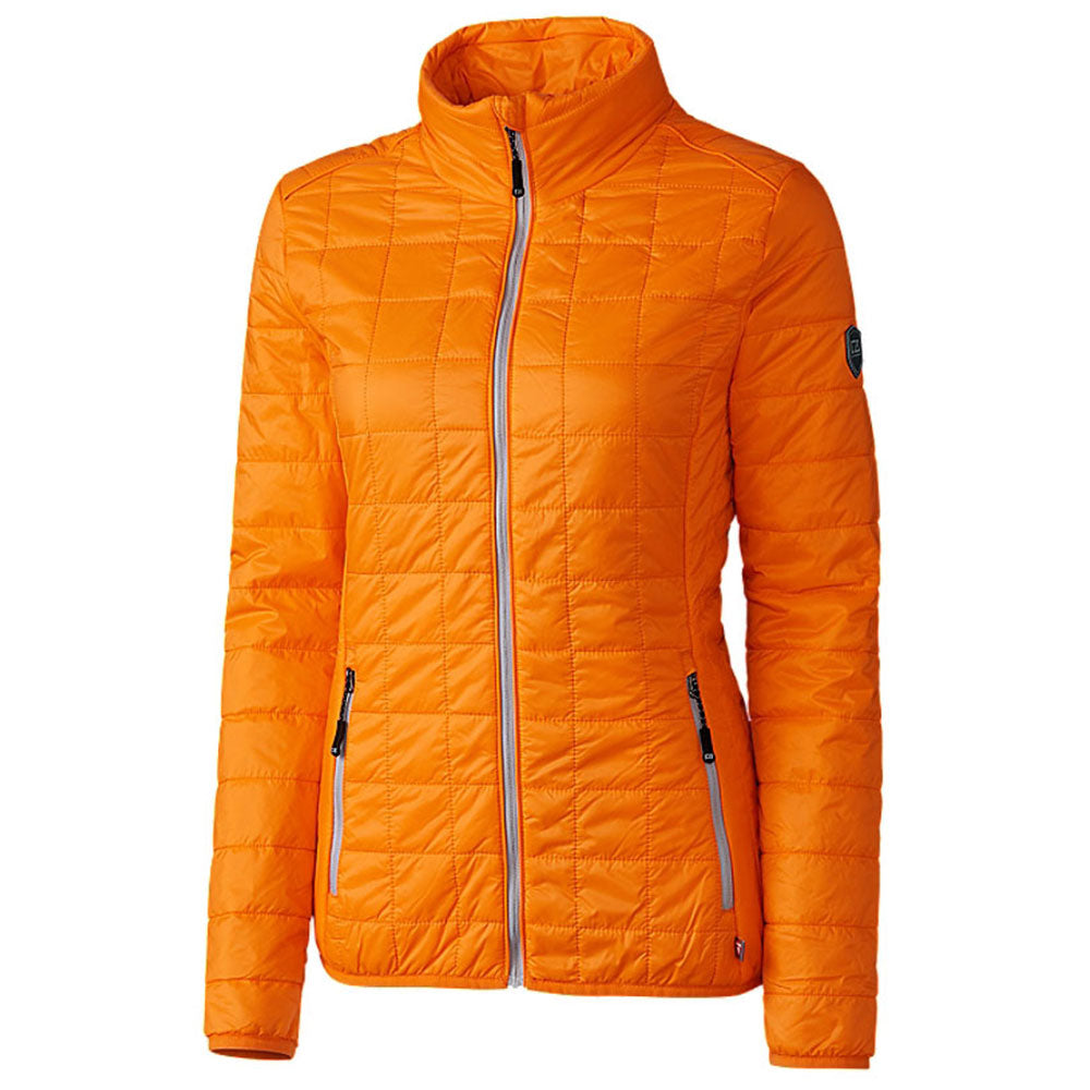 For a ladies' long sleeve jacket that is rated from zero to 50 degree, the Cutter & Buck Women's Satsuma Rainier Jacket is a great option, especially because your company's logo can be embroidered on it. It is insulted and made from easy-care taffeta. It has a mock turtle neck, full zipper front and front pockets with zippers. It is fully lined with a concealed hood and elastic bound cuffs. For your embroidered logo there is zip in lining for embroidery access. There is Primaloft fill that is packable into the left front pocket. This vest is machine washable in cold water on the delicate cycle.Corresponding Men's Style: Cutter & Buck Men's Satsuma Rainier Jacket