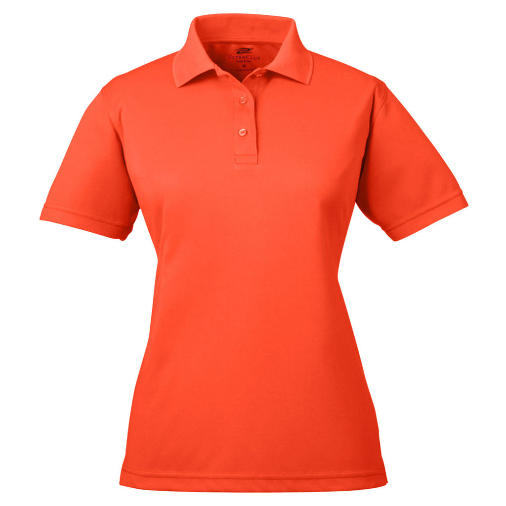 Enjoy wearing the UltraClub Women's Orange Cool & Dry Mesh Pique Polo everywhere you go. The visually appealing polo includes a fully taped flat-knit collar and three button placket with stylish dyed-to-match buttons. Moisture wicking technology quickly absorbs and removes perspiration to cool the skin. Rip and tear resistant polyester mesh pique ensures the polo lasts for years to come. Ultraviolet ray protection prevents damage to the skin, which allows you to work outdoors all day long. The feminine fit completes the design deal for the must own polo. Attach your company logo to get the word out about your brand at corporate events.Corresponding Men's Style: UltraClub Men's Orange Cool & Dry Mesh Pique Polo