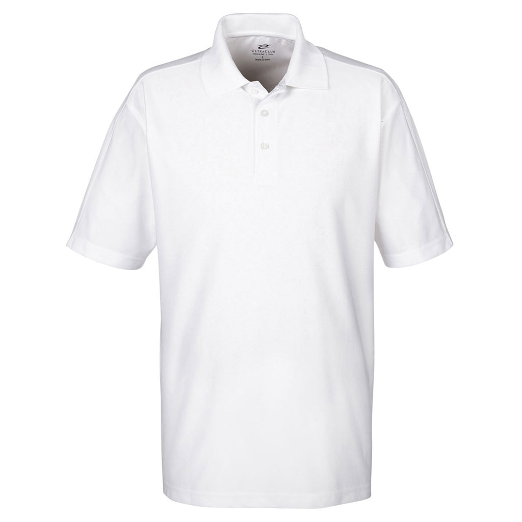 A high UPF rating makes the UltraClub Men's White Cool & Dry Elite Performance Polo a must have addition to a man's professional wardrobe. The sleek relaxed fit allows you to wear the polo to corporate events, as well as to family functions. Pull the chic polo out of the dryer and never have to deal with the nuisance called static shock. Moisture wicking technology absorbs and eliminates sweat to dry and cool the skin during a round of golf. The 100% micro-textured polyester knit polo resists the types of rips and tears that leave other performance polos hanging in the closet. Add your corporate logo to the large imprint area to reach customer prospects at business conferences.Corresponding Women's Style: UltraClub Women's White Cool & Dry Elite Performance Polo