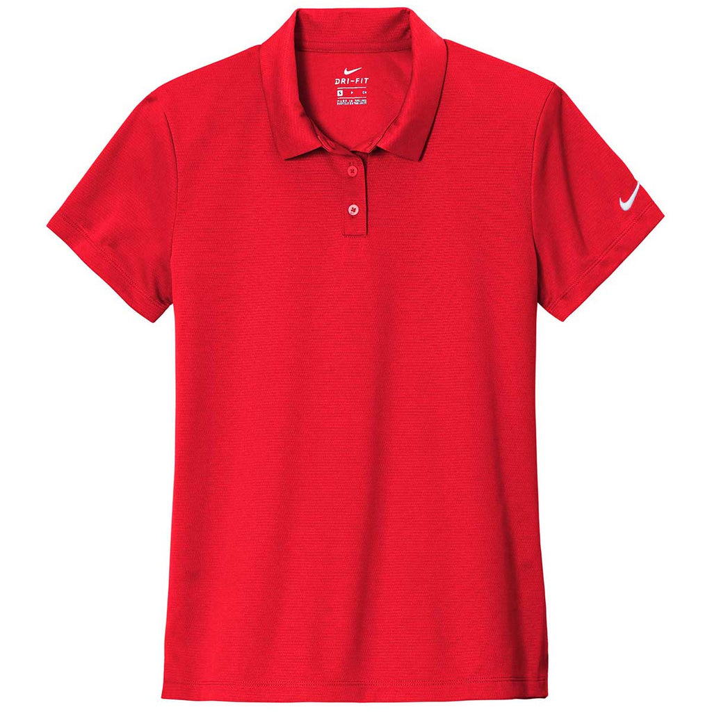 Head to the office or enjoy a round of golf in an embroidered Nike Women's University Red Dry Essential Solid Polo. The beautifully made classic polo can be used for anything from a company uniform to a solid choice for a corporate event with an embroidered custom logo. This must have polo provides Dri-FIT moisture management technology so your focus can remain on what you are doing rather than concern for sweat marks. The tailored feminine fit looks great with a custom design. Place an order today to use these as employee or end of the year gifts for all the people you know.