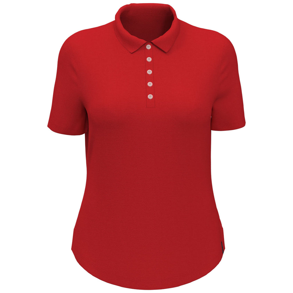 Add embroidery to the Perry Ellis Women's Salsa Red Classic Polo for a simple yet upscale look that can go from the office to dinner with friends with ease. This short-sleeved polo with a button-up placket can be worn alone or with a jacket depending on your knees. Ideal for tennis, golf, work, or fun. Place an order today.