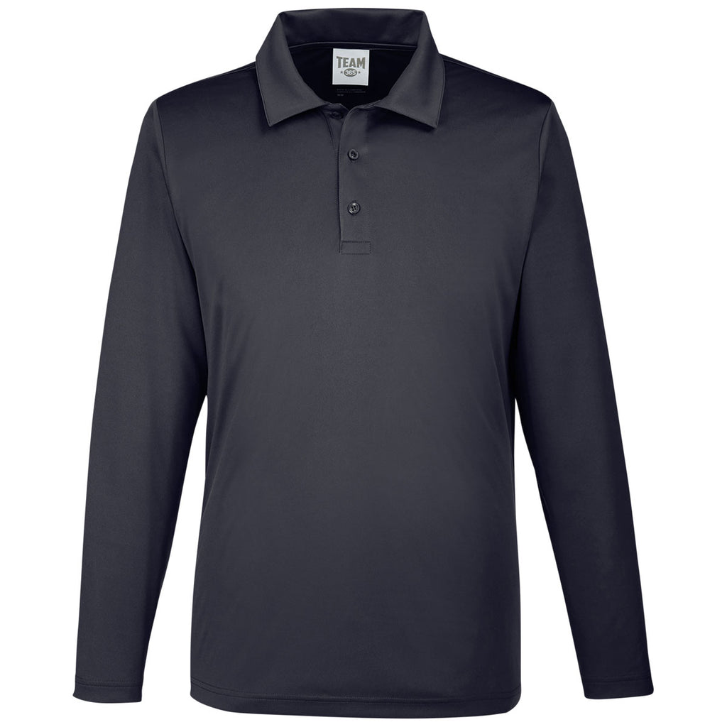 Choose just the right company logo for the Team 365 Men's Black Zone Performance Long Sleeve Polo to use as employee apparel and have workers maintain that professional look while being comfortable. Made for a busy schedule, this polo has a three-button placket, integrated collar stays, and dyed to match buttons for style and flair. The tear away label means this functional piece is also comfortable. Made of 100% polyester interlock in lightweight fabric, the polo is both moisture wicking and has UV protection for working outdoors. A custom embroidery will truly stand out on this long sleeve polo and get noticed.Corresponding Women's Style:Team 365 Women's Black Zone Performance Long Sleeve Polo