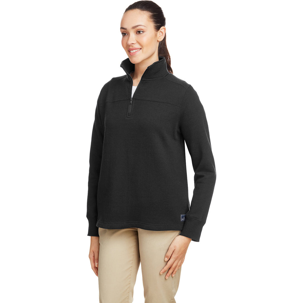 Choose a special embroidery for the Nautica Women's Black Anchor Quarter-Zip Pullover to use as personal wear or employee apparel for the cooler months. A simple quarter-zip that can be worn over almost anything, this cotton polyester fleece blend is soft and comfortable for all day wear. Add a company logo or something custom to create a look unique to your logoed apparel line or to add to your personal wardrobe. Ribbed cuffs and hem offer a better fit whether practicing on the driving range or out hiking with friends.
