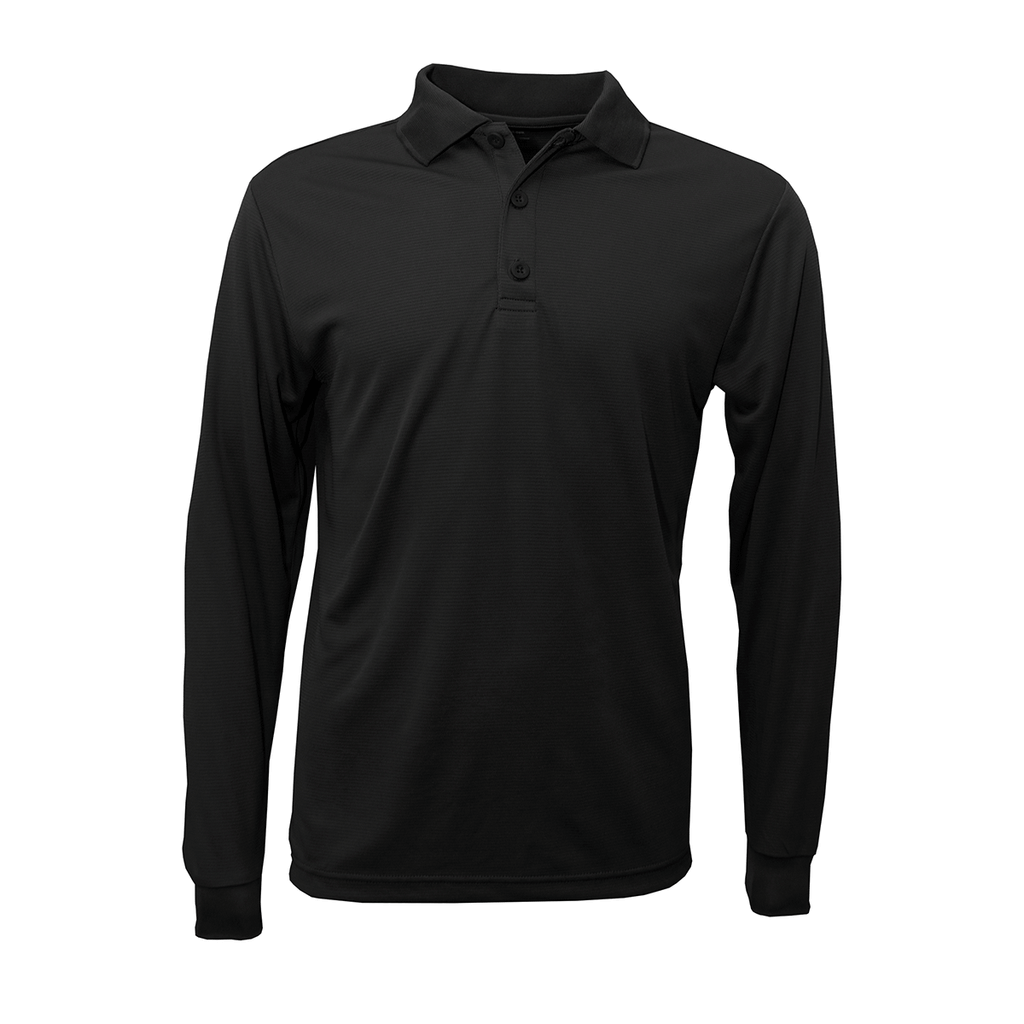 Even men who are environmentalists like a long sleeve polo for the cooler times. The BAW Men's Black Eco Cool Tek Long Sleeve Polo will soon become a favorite. Your custom logo will allow customers, potential customers and everyone who sees it that your company cares about climate change and preserving natural resources because this polo is made from recycled polyester. The recycled polyester is a moisture-managing interlock fabric. The shirt has the standard three button placket with buttons that match the shirt color. Choose from popular colors including maroon, Kelly green, black and more. They are available in sizes S to 5X.Highlights
