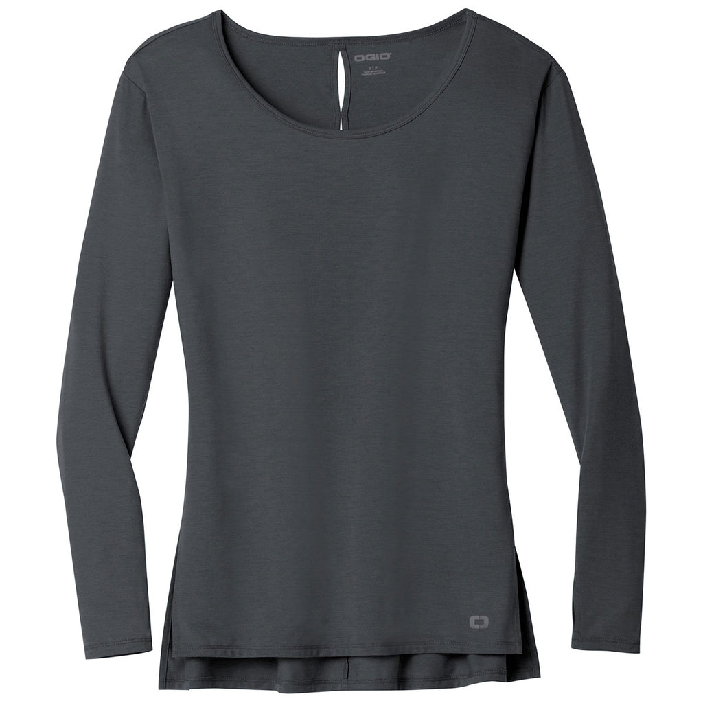 Give the gift that never stops giving for the women on your successful company team by ordering the screen printed OGIO Women's Diesel Grey Luuma Long Sleeve Tunic. The sleek long sleeve shirt is designed with mostly rugged polyester, with about one-quarter of the fabric containing Tencel lyocell for maintaining a super soft feel. Keyhole details on the back of the shirt complement the chic design of the set-in, open hem sleeves. The inviting appearance makes the tunic one of the most approachable corporate shirts available for busy professionals. Add your company logo and watch your brand soar to new heights.