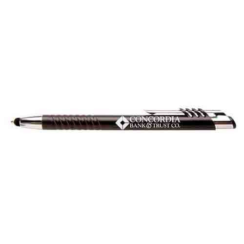 Durable metal protects the ink cartridge from damage caused by frequent drops from office desks and tables. The metal construction of the Hub Pens Black Nitrous Stylus pen also generates a sleek appearance that will turn heads at corporate events. Take advantage of the head turning by attaching your corporate logo to the large upper barrel. The ideal promotional gift contains a brushed satin finish and silver accents that create an executive appearance for the pen. Use the soft stylus to write messages on electronic devices such as an iPad or mobile tablet, without having to worry about scratching the sensitive touchscreen surface.