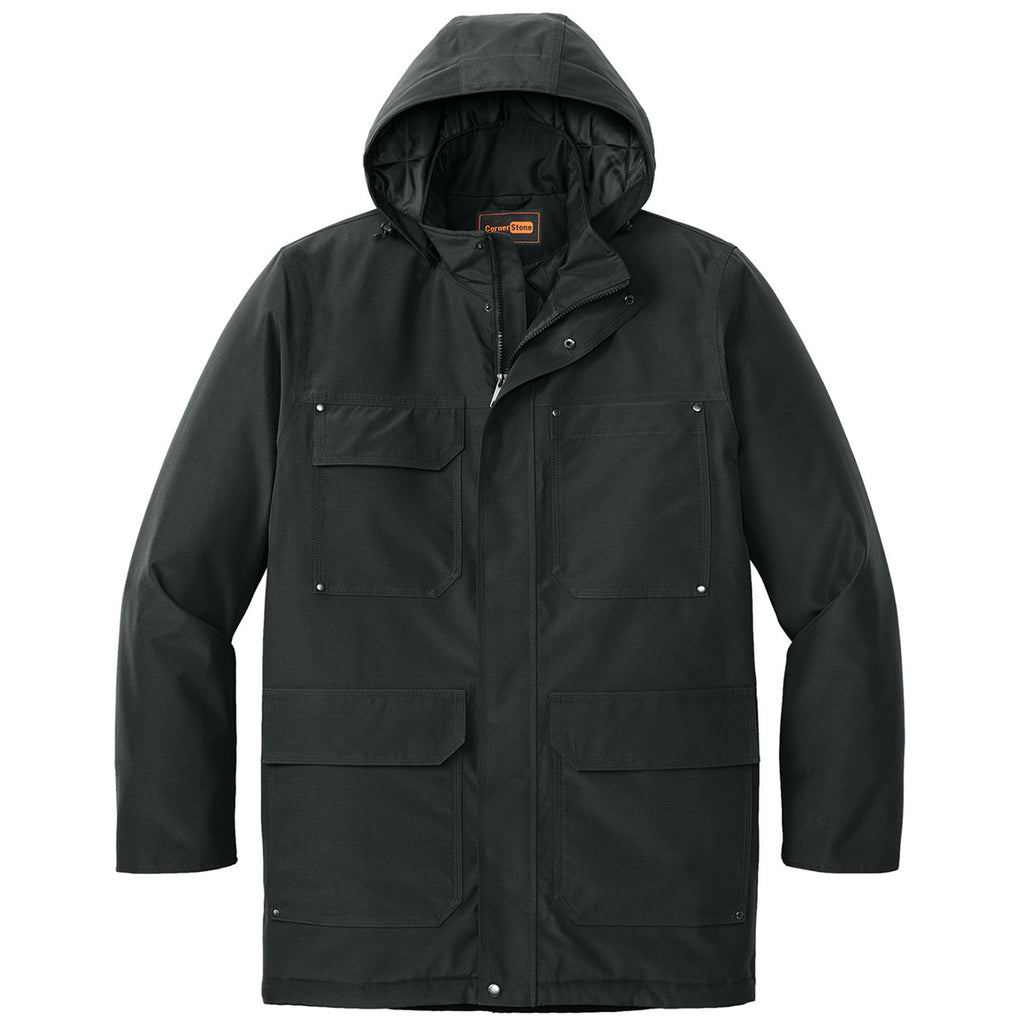Design a custom logo for the CornerStone Men's Black Elements Insulated Parka to give as a gift to the outdoorsman in your life. This insulated parka is made for outdoor work and play. Ideal for farmers, contractors, or those who love to brave the weather, it is a real must-have. Place an order right away.Highlights
