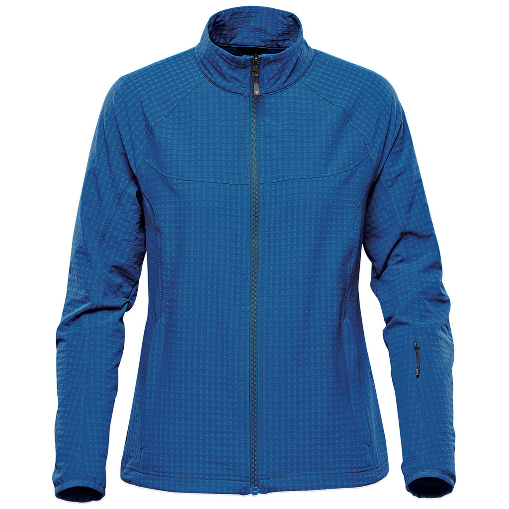 Create your own custom embroidery for the Stormtech Women's Classic Blue Kyoto Jacket. This gorgeous jacket with a futuristic feel has a hard-faced waffle backed fabric that traps warm air pockets on the interior to protect you against cold weather. Add a custom logo to create a gift everyone can enjoy for many seasons to come or a company logo to give as employee gifts. Great for a logoed apparel line or simply to add to your own wardrobe. Water resistant, breathable, and perfect for everything from working out to a hike in the mountains, this jacket is a true must have.Corresponding Men's Style:Stormtech Men's Classic Blue Kyoto Jacket