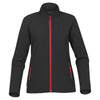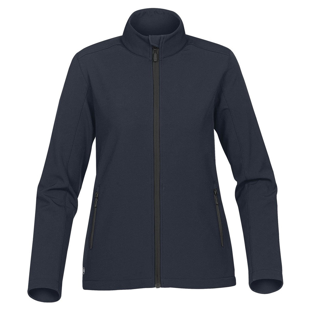 With a modern fit and streamlined look, the Stormtech Women's Navy/Carbon Orbiter Softshell jacket not only offers lightweight protection from the elements, but does so with style. It has ample room for your company logo and high contrast zippers that add colorful detail. Wearers will appreciate the chin saver and fleece backing that offer comfort and warmth. Several zippered brushed tricot lined pockets provide places to stash everyday items like a phone and sunglasses without fear of scratches. The jacket makes a thoughtful corporate gift to recognize valuable employees and clients.Corresponding Men's Style: Stormtech Men's Navy/Carbon Orbiter Softshell