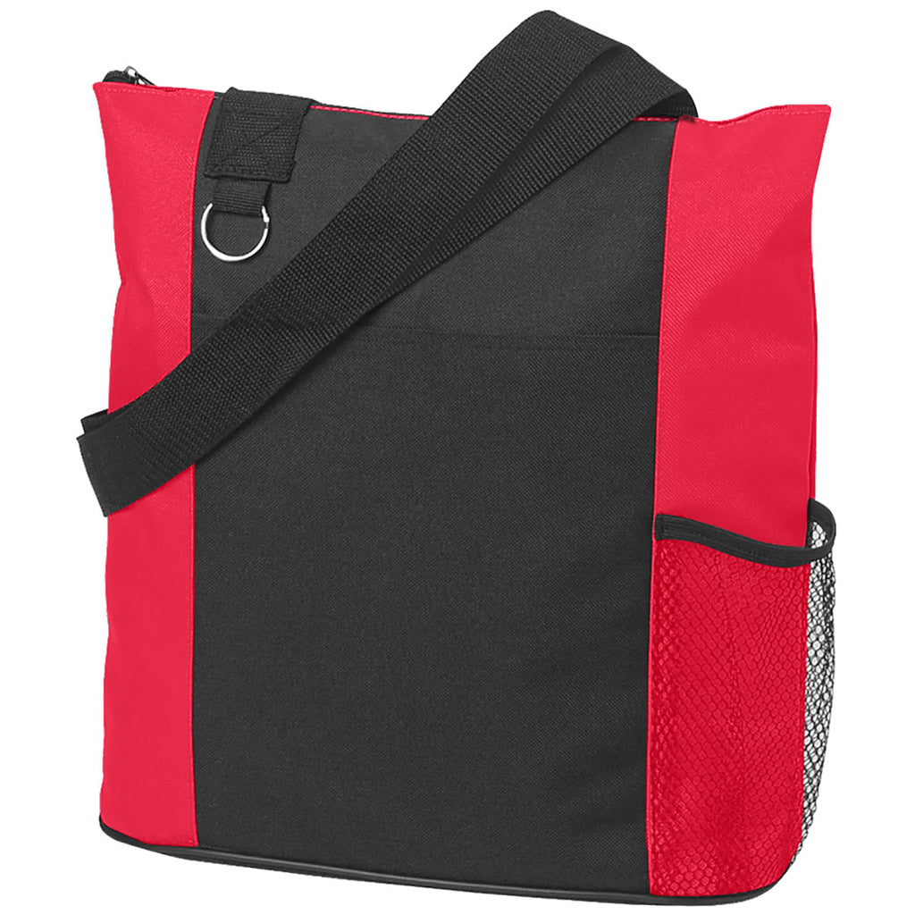 Get organized with the Hit Red with Black Fun Tote Bag and your choice of custom screen print. Available in a wide range of colors, this tote has a black shoulder handle and a black center panel with colorful sides. The side mesh pocket is great for a water bottle or keys. Provide these for teachers, nurses, travel, or the morning commute.