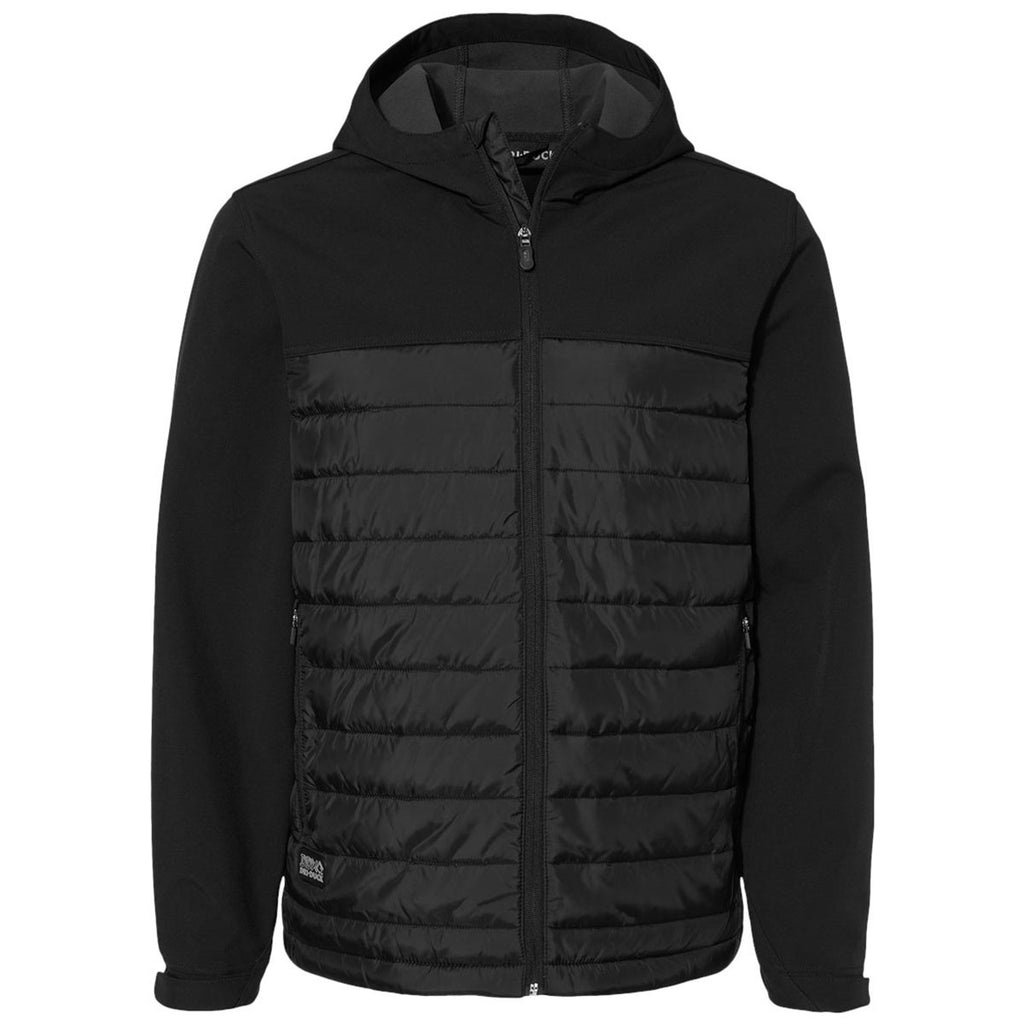 Your custom logo on the Dri Duck Men's Black Pinnacle Soft Shell Puffer Jacket will stand out whether used for work or play. Made of a polyester rich spandex blend with bonded softshell upper body and sleeves and puffer style lower body, this is a unique look and feel that will turn heads. Great for the outdoorsman in your life, add embroidery to the water-resistant full zip that will be an instant favorite. A three-piece hood with scuba collar and drawstring as well as adjustable cuffs and zippered hand pockets means this jacket is ready for what life brings to your day.