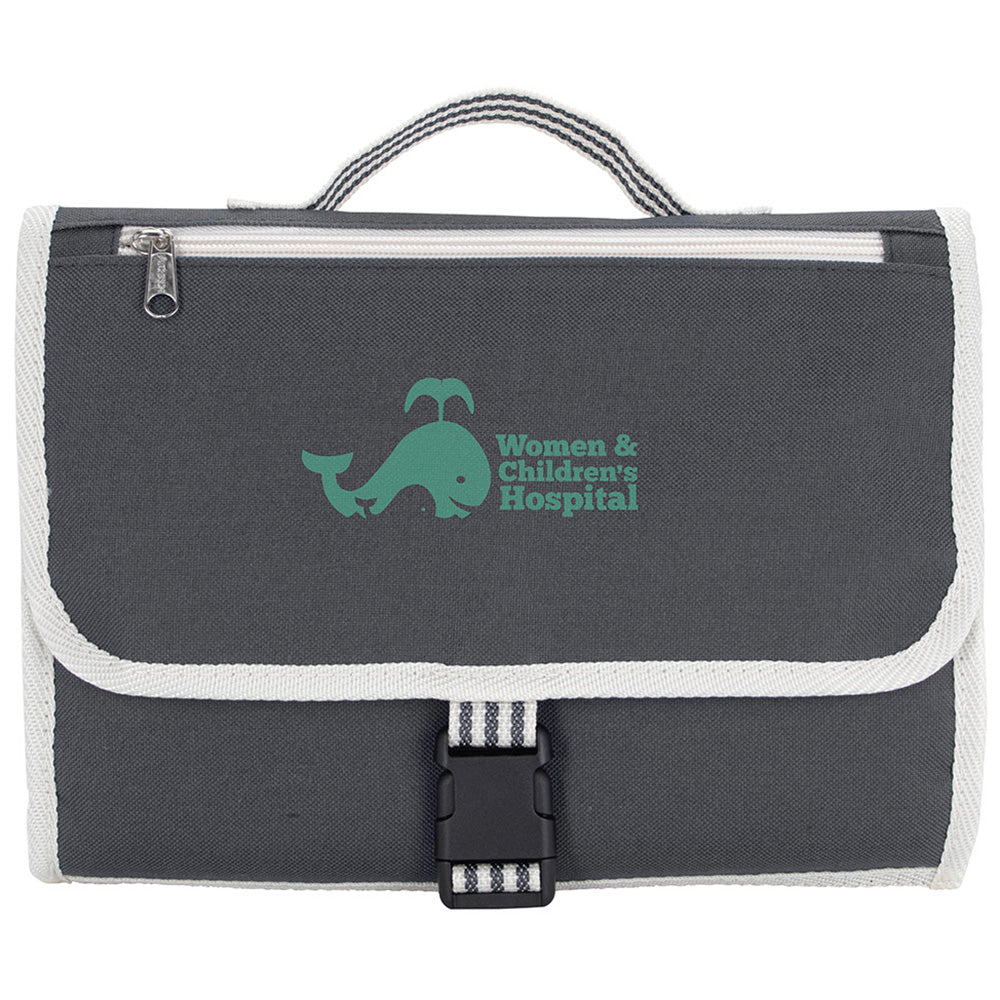 Make things easier with a custom Atchison Grey Stripe Diaper Changing Travel Pouch/Mat. Changing a diaper while traveling can be a pain, but this foldable mat gives you a safe, clean surface every time. Two mesh pockets are perfect for diapers and wipes while the front pocket will hold your phone and keys. Drop this in the diaper bag and go. Great as a baby shower gift. Order now.The minimum order for this product is 50 pieces.