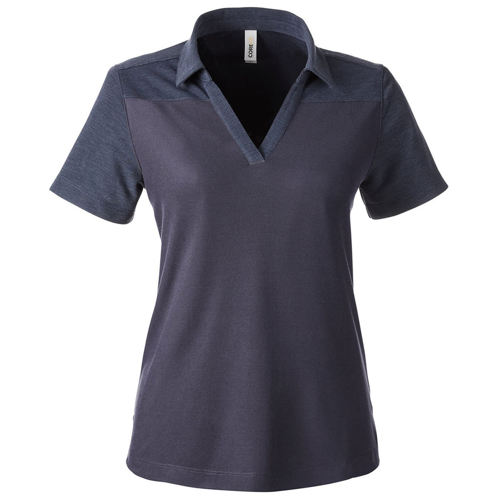 Core 365 Women's Classic Navy/Classic Navy Heather Fusion ChromaSoft Colorblock Polo with a custom logo is a lightweight polyester pique with antimicrobial and moisture-wicking properties to keep you feeling fresh and clean. The V-neck placket adds flair with a contrast heather pique on top so you look great while working, playing tennis, or simply going about your day. Place an order today.Highlights