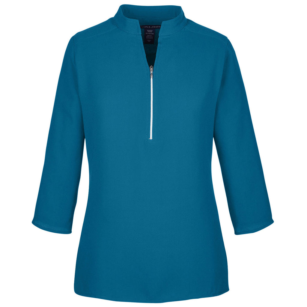 Try out a custom logo on the Devon & Jones Wome Dark Teal Perfect Fit 3/4-Sleeve Crepe Tunic for a unique form of employee apparel that will stand out. Add a company logo to the 100% polyester crepe tunic to allow guests to easily identify those in charge and seek services as needed. The center front metal zipper has an auto-lock teardrop slider and the side slits allow for ease of movement. A perfect fit style with a longer length means full coverage whether bending stretching or whatever else the job requires. Ideal for sales staff, those who work closely with people offering one on one services, and much more.Highlights