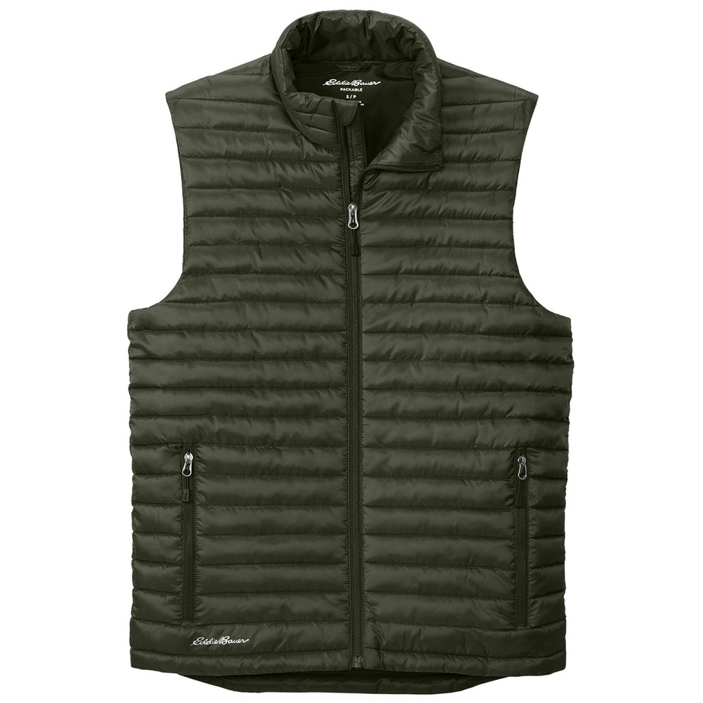 Eddie Bauer Men's Olive Green Packable Quilted Vest with a custom design is a fun and functional way to stay toasty while enjoying the Great Outdoors. This packable vest can be worn and then easily packed away when it is no longer needed for the day. Perfect for hiking, camping, and hunting. Place an order right away.This product can only ship within the United States, Puerto Rico, Canada, and Mexico.