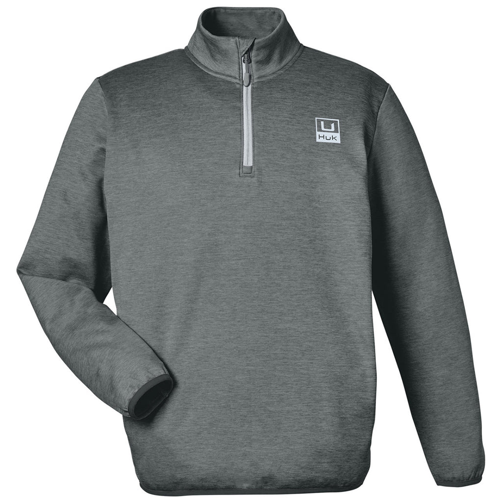 HUK Men's Volcanic Ash Heather Cold Front Quarter-Zip with a corporate logo is a simple way to create employee apparel that can also be shared with others. This simple quarter-zip is ideal for meetings outside the office, on the golf course, or when working in client's homes. Made of water-repellent material with 4-way stretch and dual hand pockets, this is a must-have.Highlights