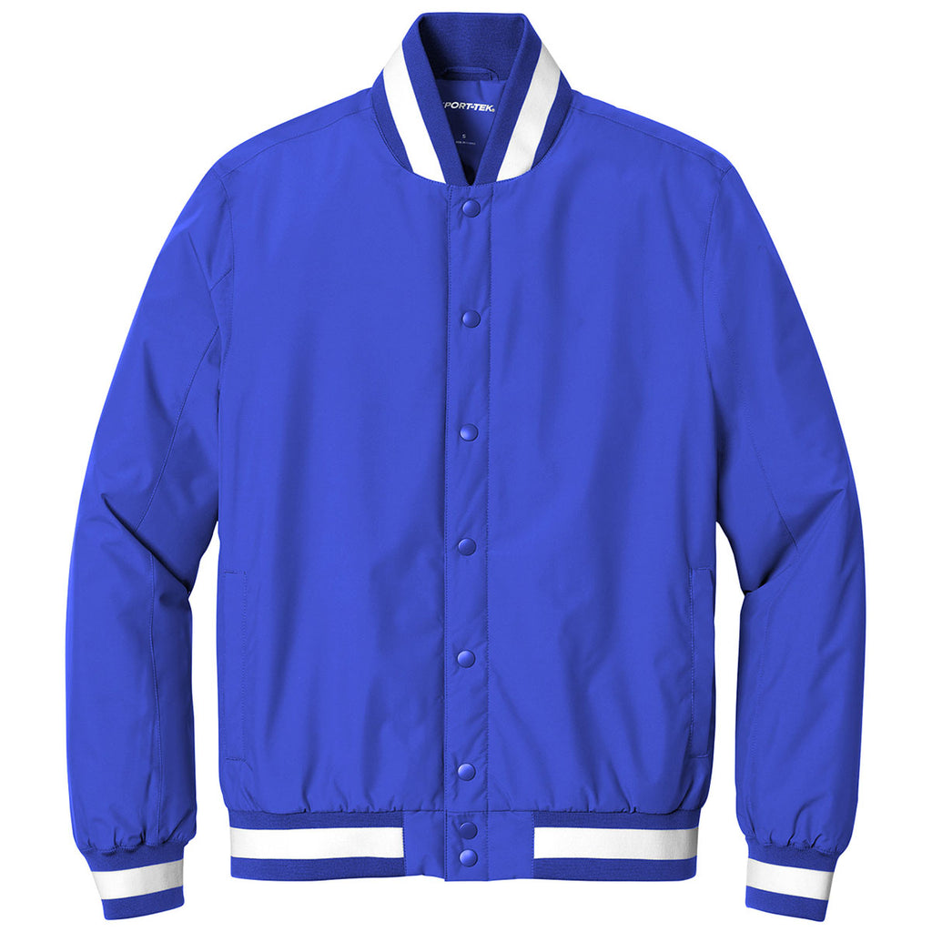 Sport-Tek Men's True Royal Insulated Varsity Jacket with a custom logo is a great gift for yourself or others. The snap-button jacket screams coach or team member. The water-resistant coating and tag-free design make this great as part of team gear or for those supporters attending the games. Place an order today.Highlights