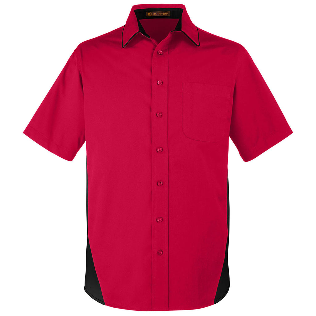 Design a custom logo for the Harriton Men's Red/Black Flash Colorblock Short Sleeve Shirt for a unique look that will stand out in a crowd. This gorgeous colorblocked design made of a cotton, polyester twill has pops of color in just the right spots. Create employee apparel that looks and feels great with dyed to match buttons and contrast side vents to really stand out. Add a company logo and choose colors to represent your company in this short sleeve shirt that will keep employees looking and feeling good with wrinkle resistant, stain release fabric that will last a long time with daily wear.Corresponding Women's Style:Harriton Women's Red/Black Flash Colorblock Short Sleeve Shirt