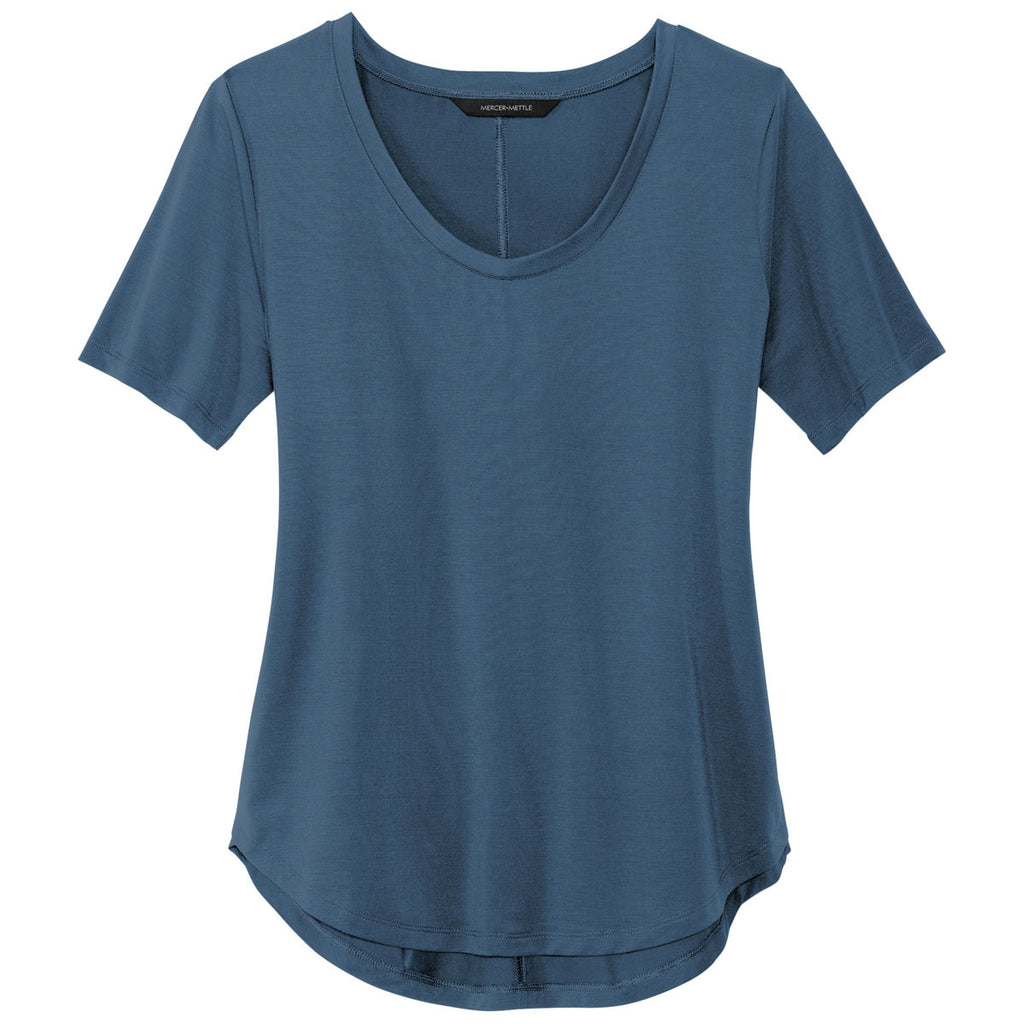 Mercer+Mettle Women's Insignia Blue Stretch Relaxed Scoop tee with custom logo is the ultimate in comfort with a relaxed fit and moisture wicking in a spandex jersey blend, this short sleeve tee will showcase your screen printing with style and flair. Place an order today to have these as soon as possible.Corresponding Men's Style: Mercer+Mettle Men's Insignia Blue Stretch Jersey Crew
