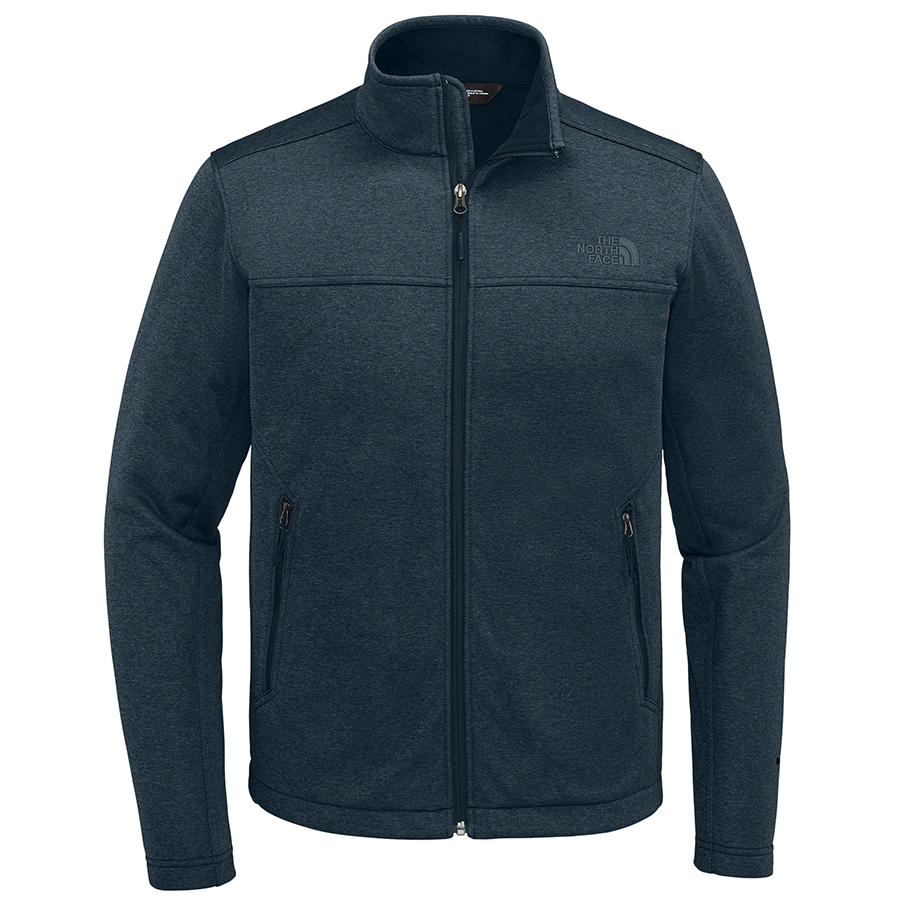 Design a corporate logo for The North Face Men's Urban Navy Heather Chest Logo Ridgewall Soft Shell Jacket to create a custom gift or uniform for employees. The high-end, full-zip jacket offers a high wind resistant, water repellant finish that is made for outdoor work and play. Ideal for trade shows, those who work directly with clients, or outdoor events.This product cannot ship outside of the United States.