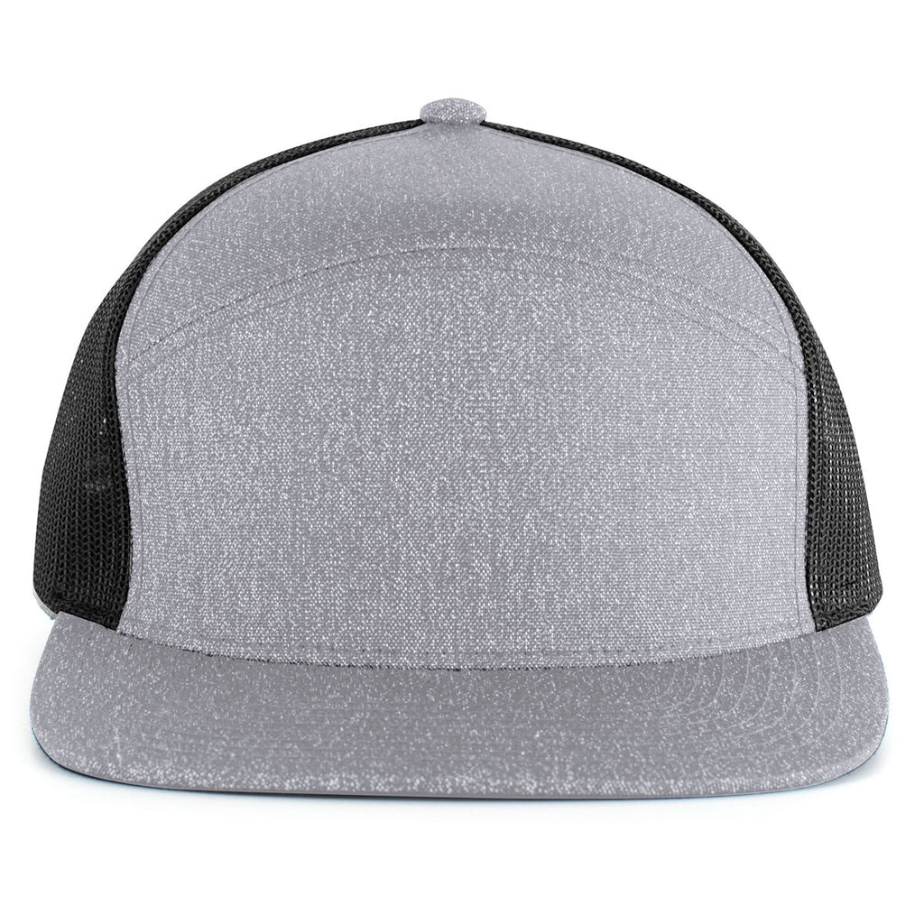 Get noticed in the custom Pacific Headwear Grey Heather/Black Heather 6-Panel Arch Trucker Snapback Cap. This two toned cap is a throwback to the traditional trucker cap with a more modern appeal. Add a company logo to offer as part of employee apparel to show affiliation with your group or company. Great for those who spend lots of time outdoors, the trucker mesh is made of a polyester blend on the front panels with a pro-stitch finish and true melange heather front panels. A full profile crown sits a bit higher with a flat visor and traditional snapback closure for adjustable fit.Highlights