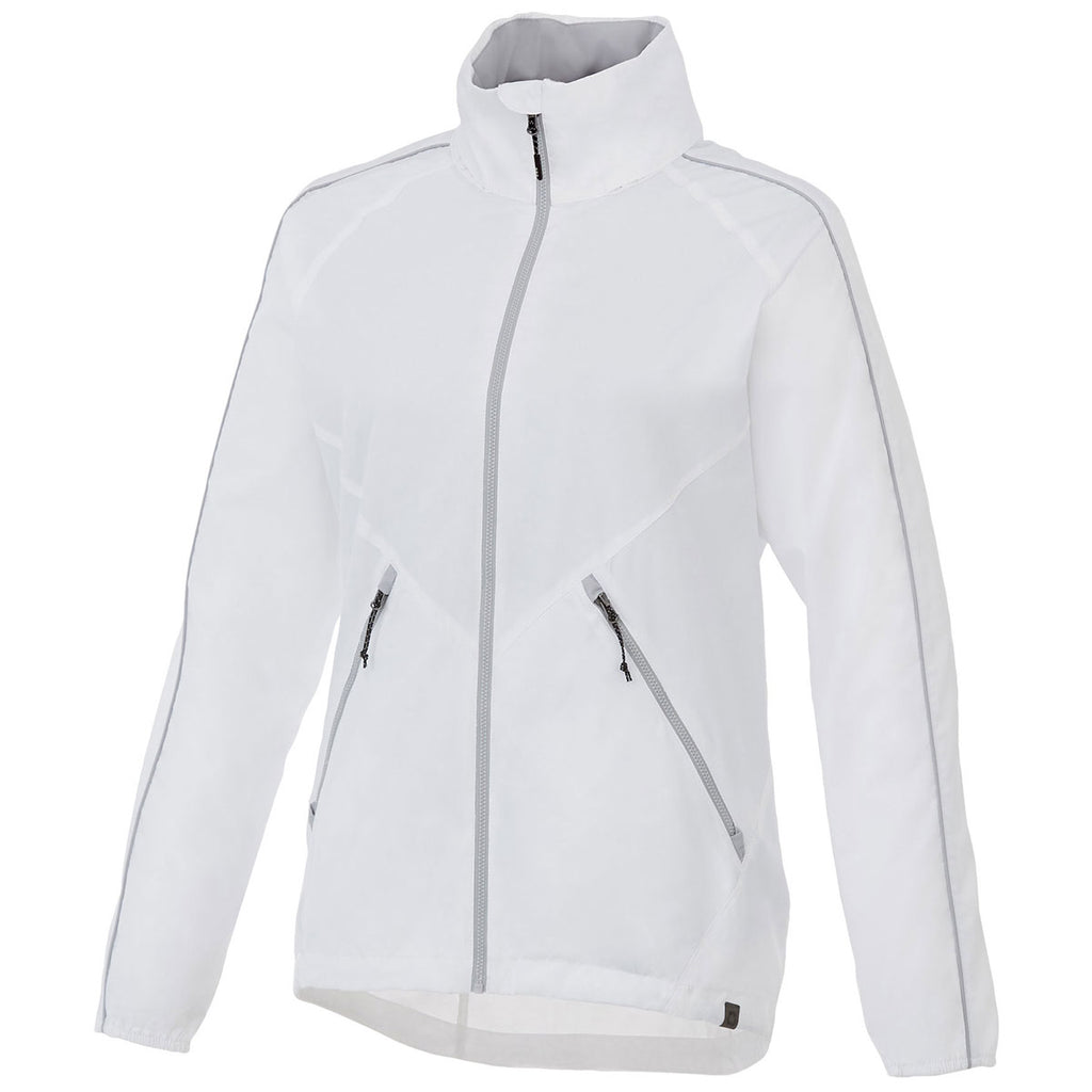 Create a custom look with the Elevate Women's White/Silver Rincon Eco Packable Jacket with embroidery to match your taste and design. The wind and water-resistant jacket is made of partially recycled materials to help the environment while keeping you looking great. Great for hiking, biking, and enjoying the outdoors, this jacket can also carry your company logo to use as employee apparel. The front zip pockets keep small items safe and the stow away hood keeps you protected when nature strikes. Best of all, when you are done wearing this jacket, stow it away in the built-in sack and pop it into a purse or backpack.Corresponding Men's Style:Elevate Men's White/Silver Rincon Eco Packable Jacket