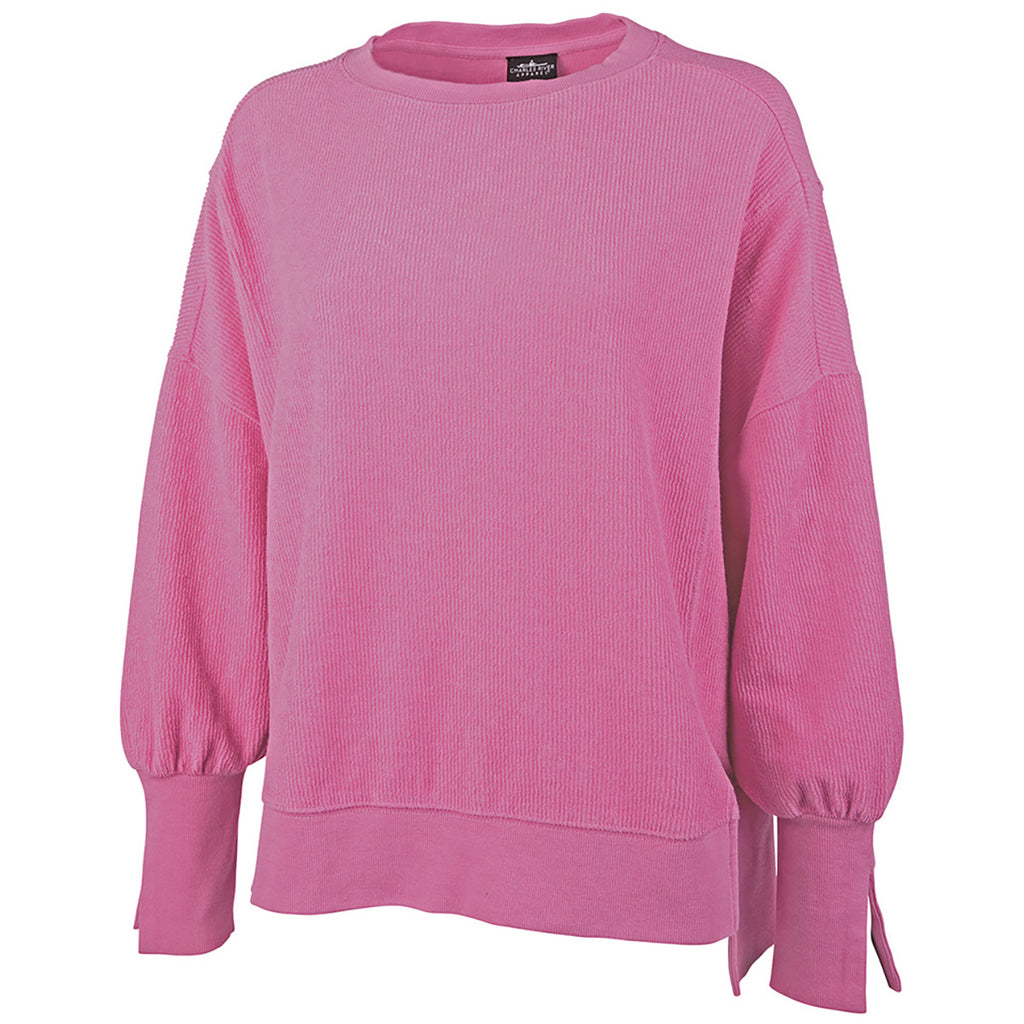 Choose embroidery for the Charles River Women's Pinkberry Camden Spliced Crew Neck Sweatshirt. This crewneck pullover is oversized with a drop-shoulder for a comfortable look and feel. Great for attending a sporting event, hanging out with friends, or relaxing at home, this is a cozy addition to your wardrobe.Highlights