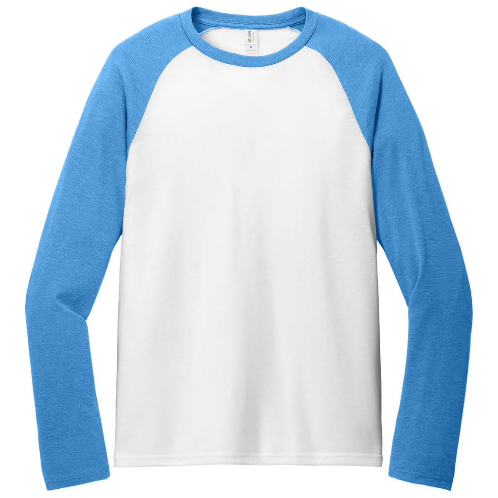 Allmade Unisex Azure Blue/Bright White Tri-Blend Long Sleeve Colorblock Raglan delivers custom style for corporate teams and eco-conscious consumers alike. Its tri-blend fabric feels incredibly soft while holding shape through repeated wear. With its classic raglan design and color block appeal, this tee transitions seamlessly from branded group apparel to casual weekend wear.