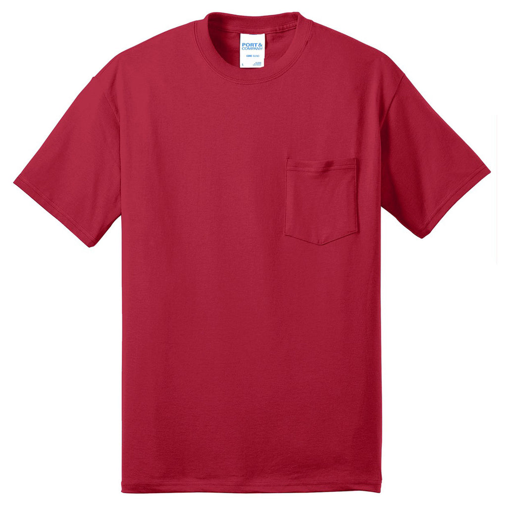At the next company sponsored event, hand out the printed Port & Company Men's Red Core Blend Pocket Tee to thank the loyal customers that have made your business a superstar in the community. Opposite the convenient left chest pocket is an area to attach a custom logo. With a logo, you connect with customer prospects at industry trade shows. Port & Co blends recycled polyester into the fabric not only to bolster the strength of the long lasting tee, but also to make an eco-friendly fashion statement. Super smooth cotton delivers all day comfort to keep you energized.Highlights
