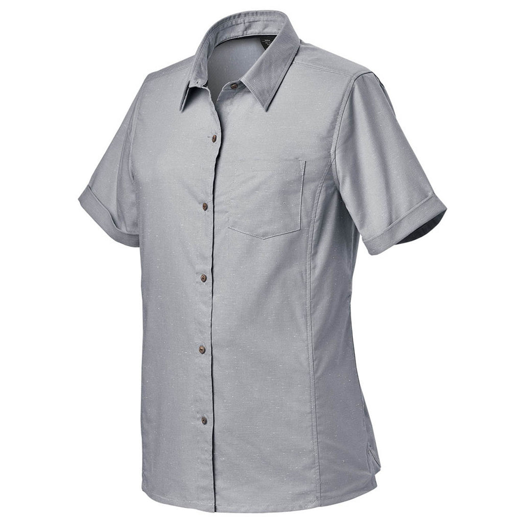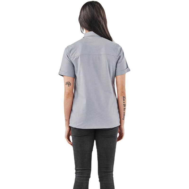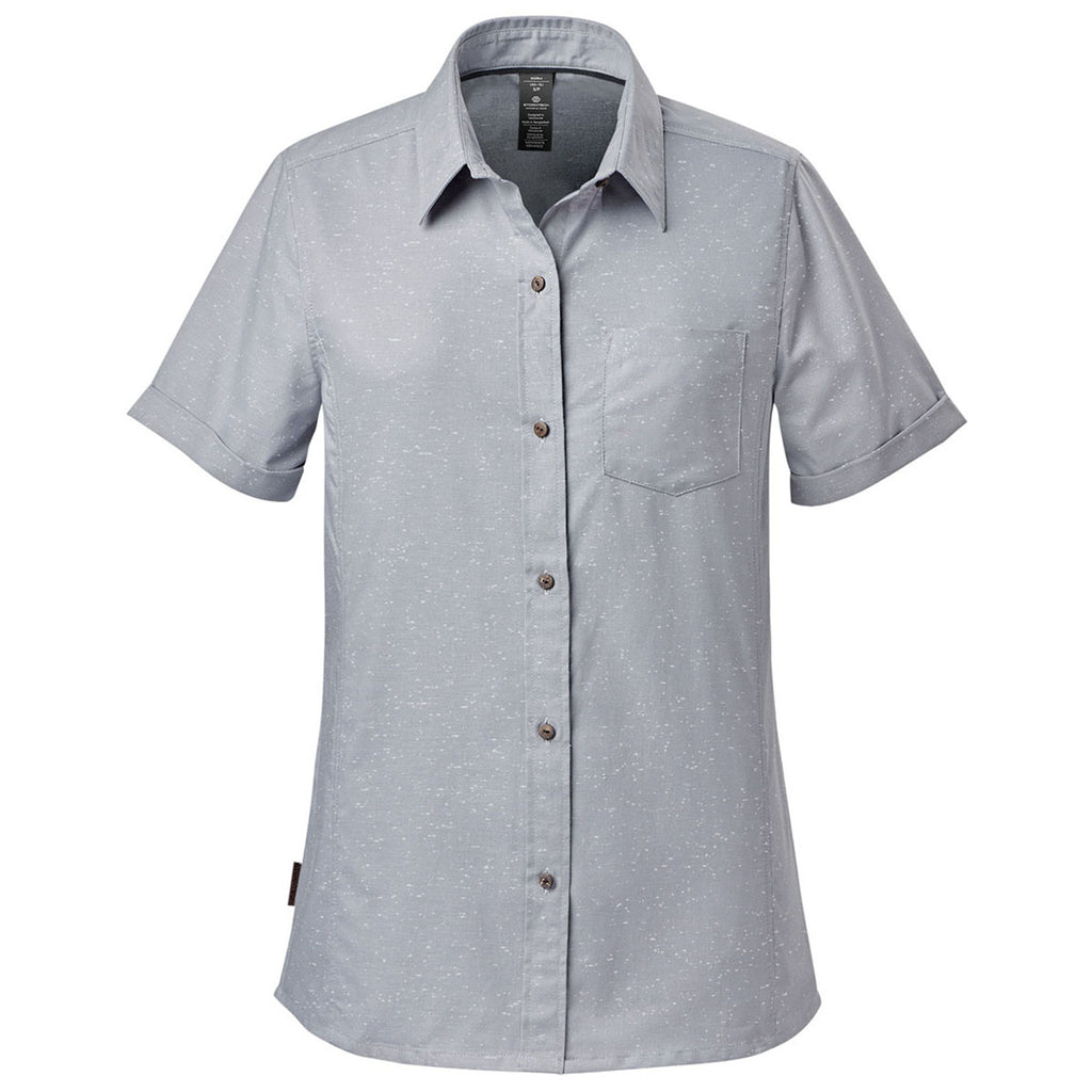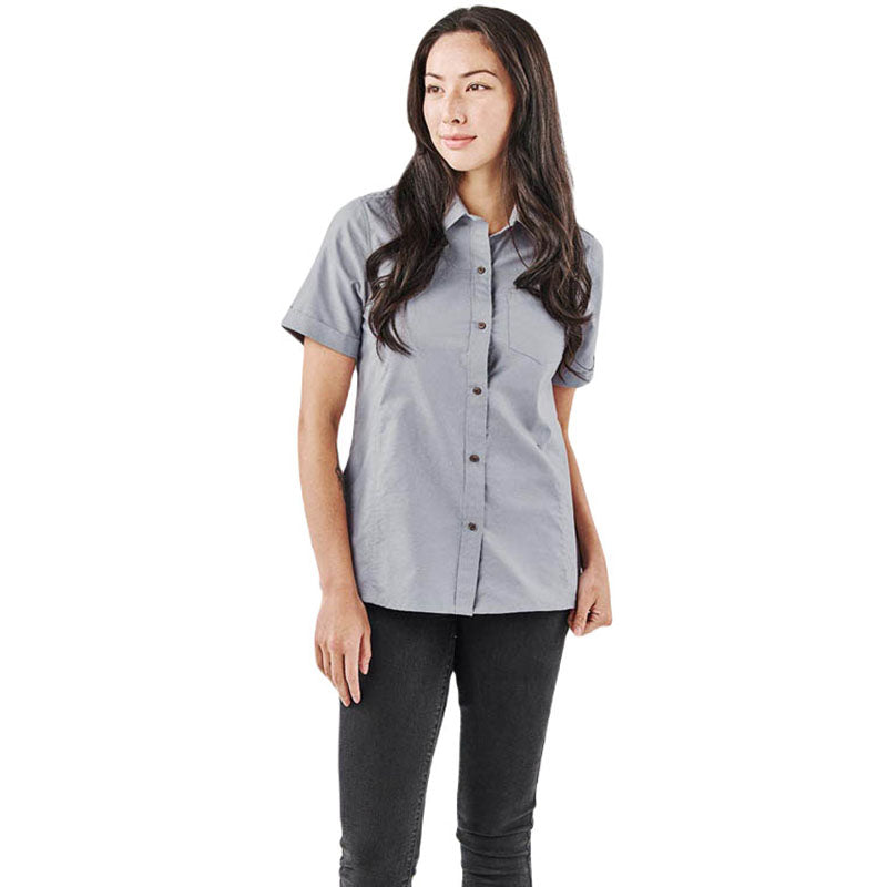 Your team will look crisp and classic when they're wearing a Stormtech Women's Zinc/White Skeena Short Sleeve Shirt that includes your company's custom logo or design. A lightweight, heathered slub fabric gives it an effortless feel and a timeless look that is only elevated by exceptional extras like coconut buttons and a contoured hemline.