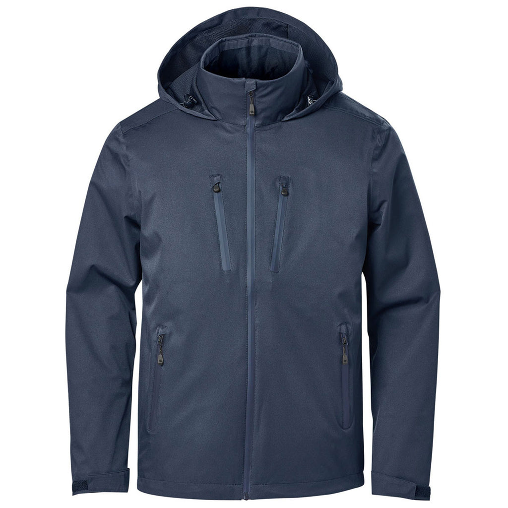 The Stormtech Men's Navy Scirocco Lightweight Shell is designed to show off your company's custom logo or design even when the rain starts to pour. This all-weather jacket offers maximum protection against the elements thanks to thoughtful design elements like H2XTREME waterproof technology, a rollaway hood, and waterproof pockets.