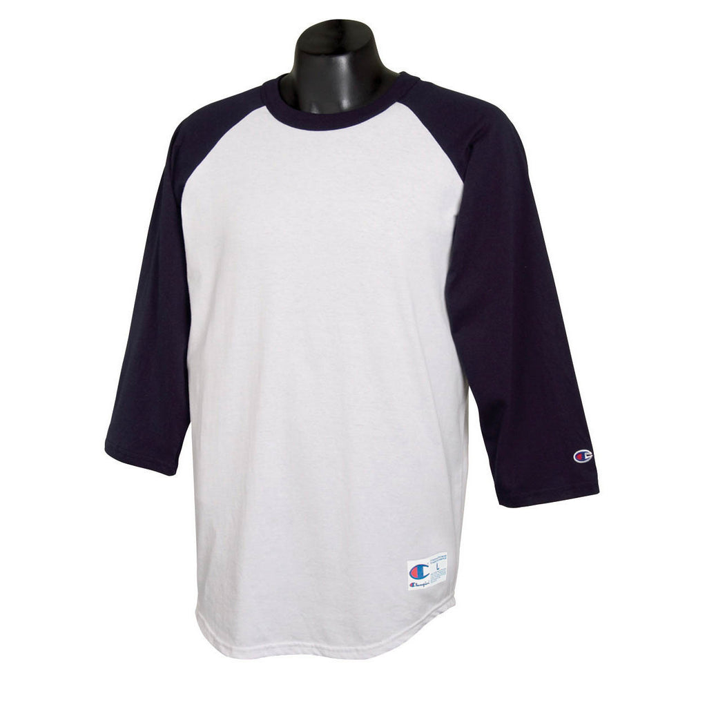 Want a T-shirt that will never go out of style? The classic design of the Champion Men's White/Navy Baseball T-Shirt is comfortable and durable enough to wear all the time--and casual enough that you just might get away with doing exactly that. The Champion Men's White/Navy Baseball T-Shirt is extremely lightweight and breathable. Made with 100% cotton, it has 3/4 length sleeves, double-needle stitching on the sleeves and bottom hem, and a logo on the left sleeve.