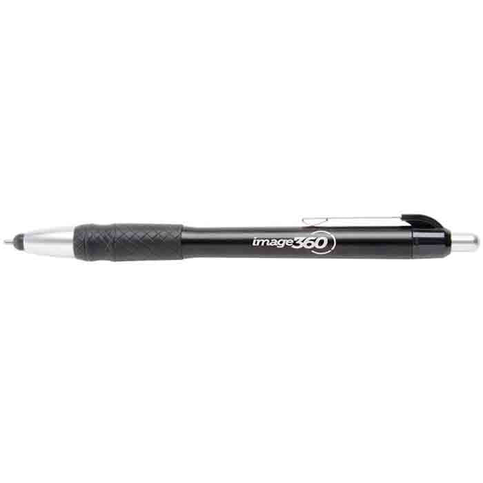 Have you grown tired of click actions Hub Pens Black Maxglide Click Metallic Stylus pens that are all click, but no action? Hub Pen has the solution to your dilemma by offering a pen that always produces a tip, after you click the mechanism that pushes the tip to a writing surface. Move between taking handwritten ink notes and sending messages via your tablet by using the soft stylus. The highly functional stylus located on the tip of the pen never scratches sensitive touchscreen surfaces. Your writing hand will thank you for using a pen that possesses an ergonomically designed hourglass shape. Add your corporate logo to make your company known throughout the community.